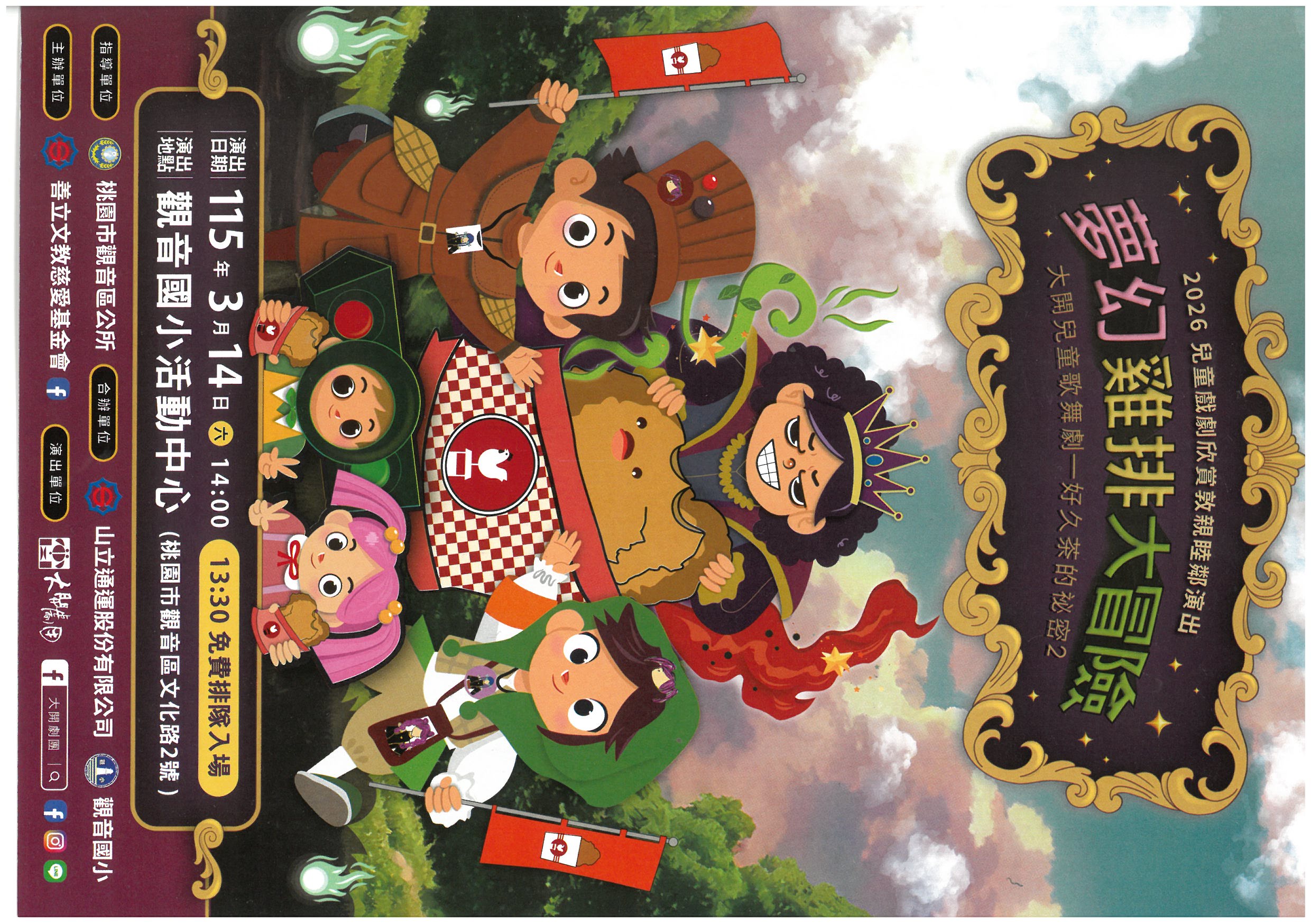 大開劇團-兒童歌舞劇《好久茶的袐密2:夢幻雞排大冒險》於115年3月14日(六)14:00免費展演,誠摯邀請您闔家光臨。