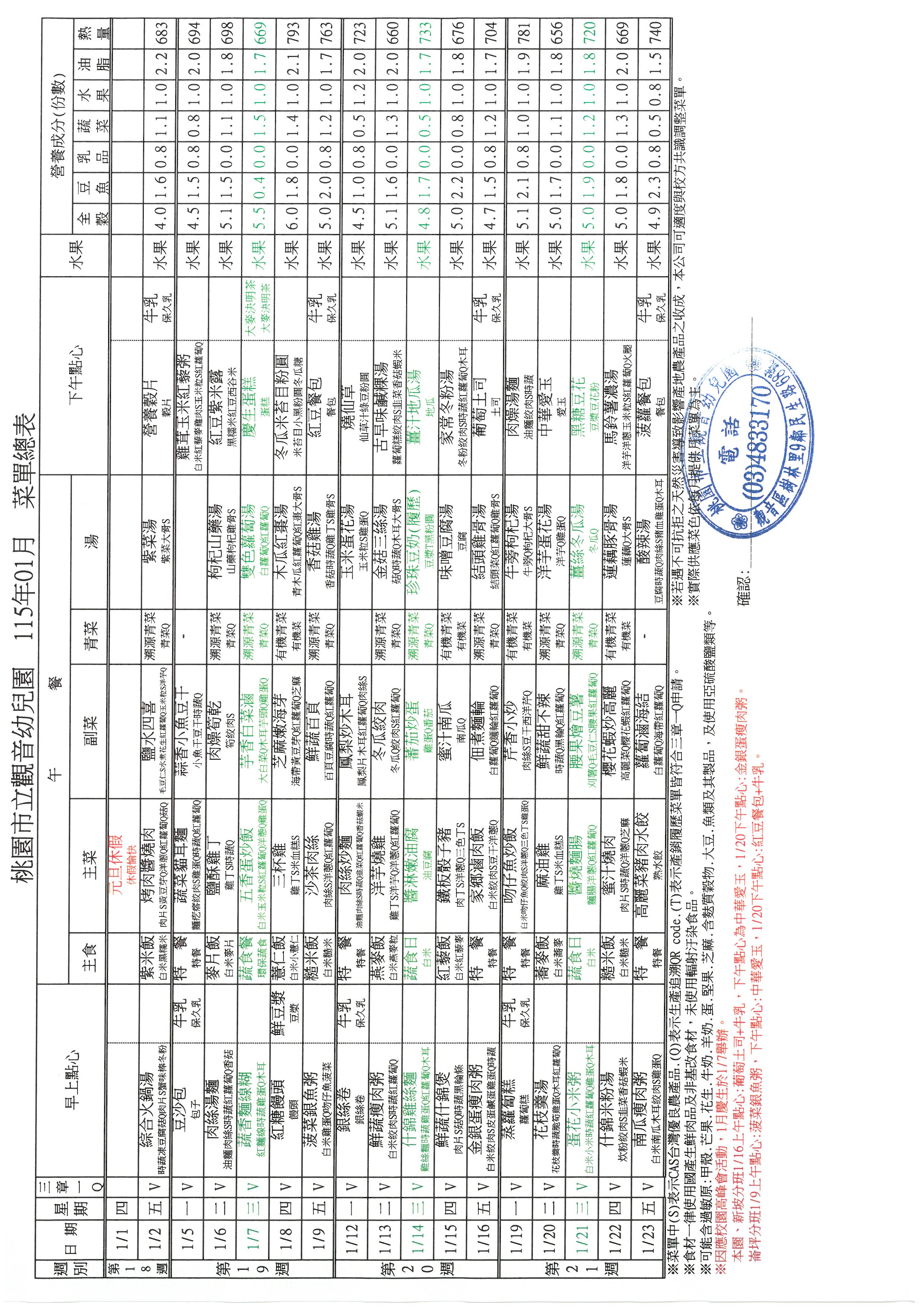 桃園市立觀音幼兒園 115年 1月份菜單 總表
