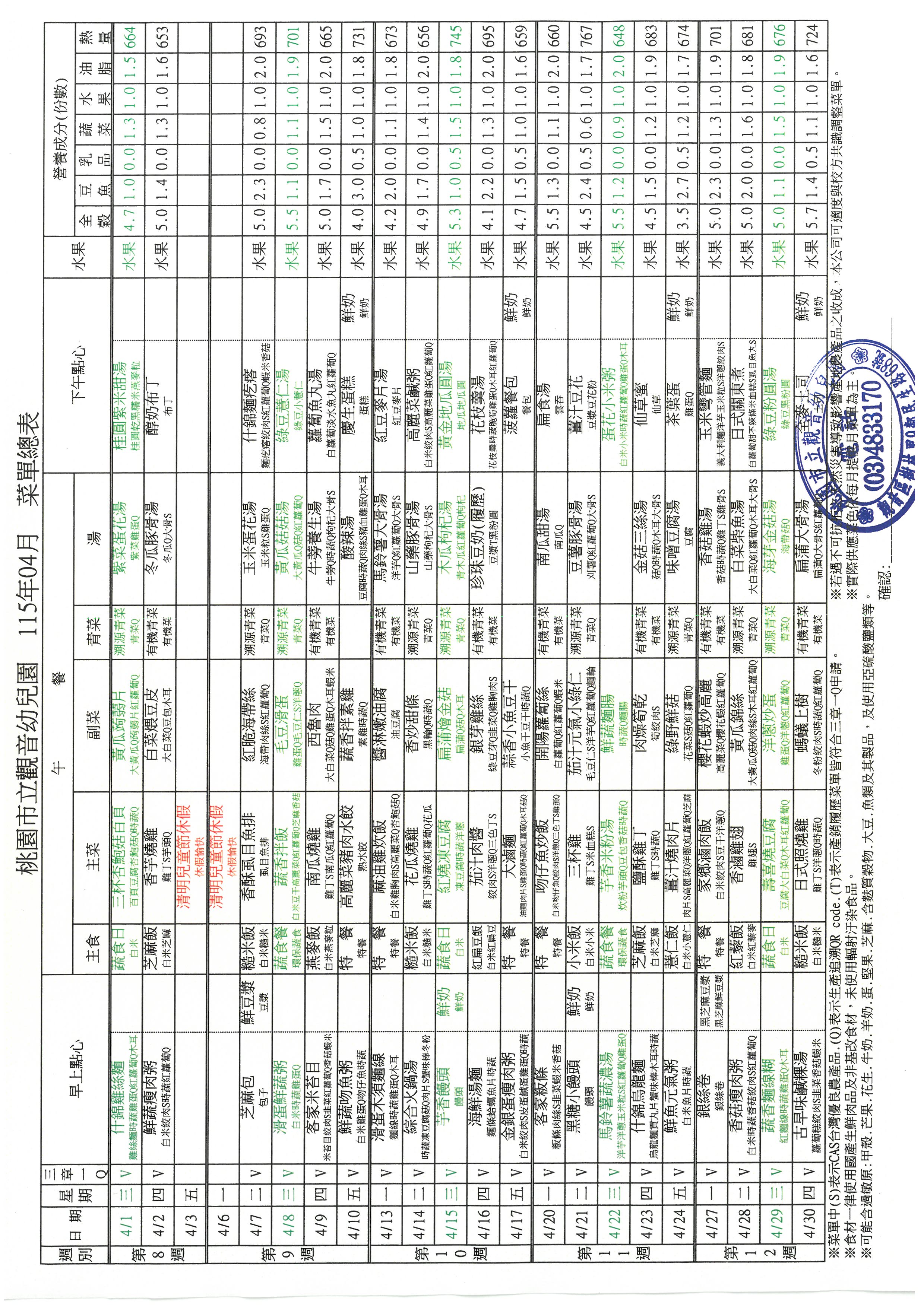 桃園市立觀音幼兒園 115年 4月份菜單 總表